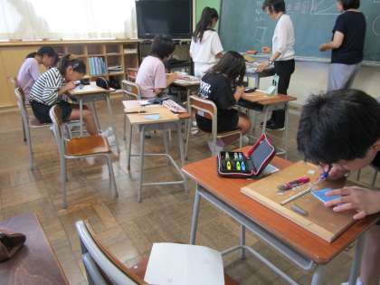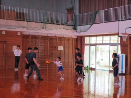 カルチャークラブでは、消しゴムはんこを作っています。彫刻刀を使って細かい部分を集中して彫っています。スポーツクラブでは、教員やイマージョンALT、スクールカウンセラーも入って一緒にバスケットボールの試合をしています。みんな汗びっしょりになり、盛り上がっていました。