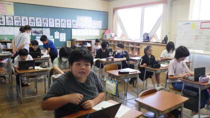紹介したい人のことをクロームブックで調べて、英語で表現する学習をしました。HeとSheの使い分けが上手にできていました。