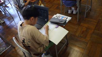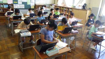 クロームブックを使って、交番や警察署の仕事を調べ、ノートに書いています。