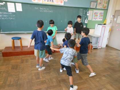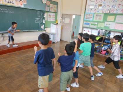 ここしばらく、夏の暑さが続いています。体育館もとても暑く感じます。1・2年生は教室で、「だるまさんがころんだ」を全員で楽しくして過ごしました。