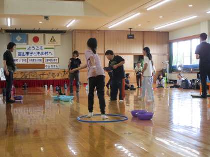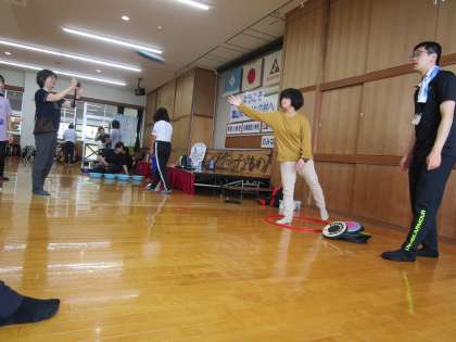 チャレンジ・ザ・ゲームを楽しみました。竹ダーツ、洗面器お手玉投げ、ドッジビーシューティングの様子です。