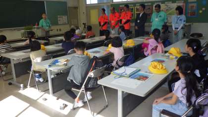 北陸農政局や富山市農林水産部の方々が来校され、農地再編整備事業についての説明を聞きました。昔の農業と今の農業を比べ、農家にとって、今までよりも楽に、安定して作物が育てられるようになったことを知りました。