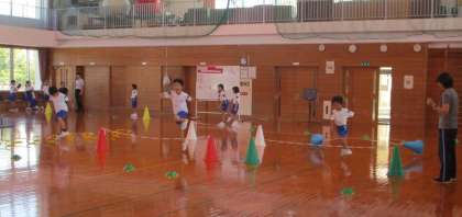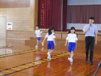1〜3年の体育科では、ハードルを速く跳ぶ「ひみつ」を見付けようと、練習しています。ALTの先生からは英語で励ましの言葉をかけてもらっています。やる気満々です。