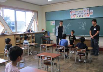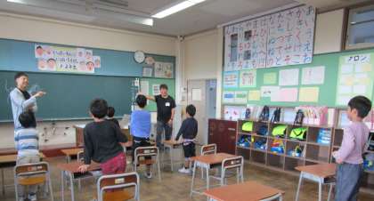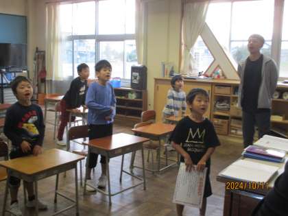 1・2年生教室では、今日の朝の会は、ALTの先生と一緒に行いました。健康観察では、担任の先生から”How are you?”と聞かれ、子供たちは、「元気ってどう言うの?」とALTの先生に尋ねながら”I’m fine.”などと答えていました。
