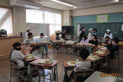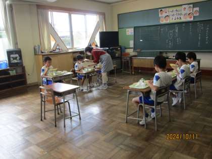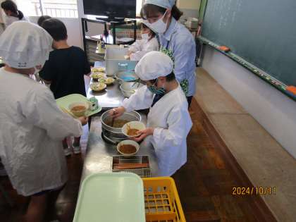 給食の時間の様子です。今日は、大好きなソフト麺のカレーソースです。