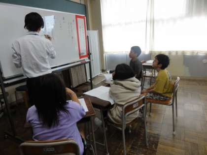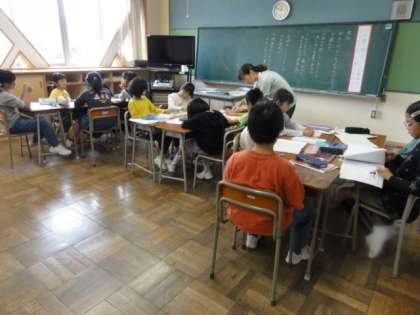 国語科では、3年生と4年生が学習課題について、自分の考えをノートに書きました。グループやペアの友達と話し合い、考えをまとめています。