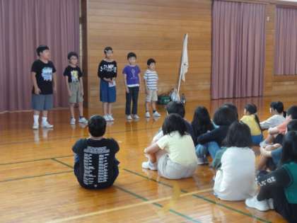 不審者が校舎付近にいるという想定で、避難訓練を行いました。子供たちは、放送の指示に従い、静かに避難場所に移動していました。避難訓練の後は、学級ごとに振り返りをし、命を守るために、どのようなことに気を付けて行動するとよいかについて考えていました。