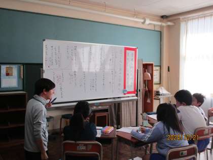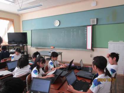 3・4年生は、国語科の学習中です。3年生は、修飾語を使った文をつくり、クロームブックに入力しています。4年生は、登場人物の気持ちを考えています。