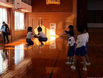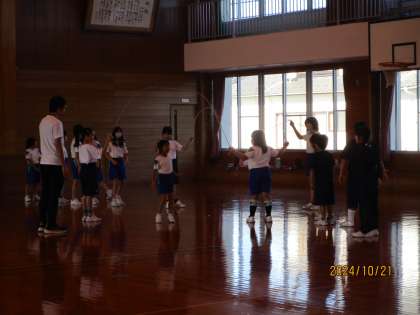 全校体育の様子です。長縄を使った団体技の練習中です。