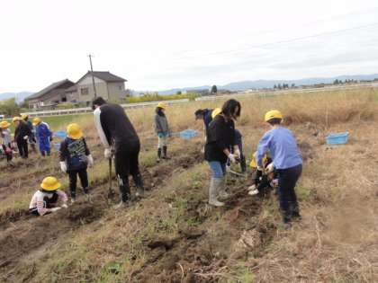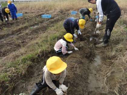 畑に植えたサツマイモを収穫しました。先日の雨のため、畑にはかなり水がたまっていましたが、前日に教職員で畑の水を取り除く作業をしました。畑の中からサツマイモを見付けると、子供たちはうれしそうに歓声をあげていました。