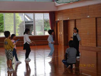 今日も心地よい天候です。子供たちは、サッカーやスキー山で遊んでいます。体育館では、なわとび発表会に向けて、進んで技の練習をする子供たちが見られました。
