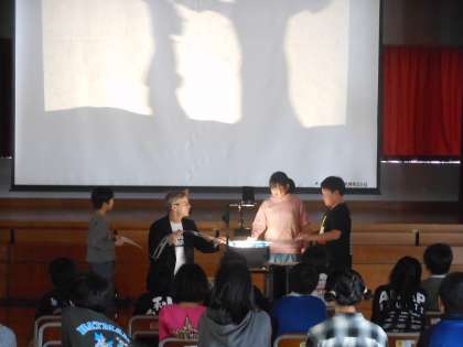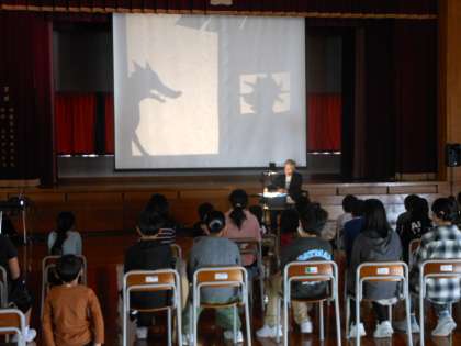 全校児童でジャックリーランダルさんによる影絵講演を鑑賞しました。影絵の動く様子や英語を交えた台詞がとても面白く、楽しんで鑑賞している様子が見られました。また、児童代表の終わりの言葉を6年生が担当し、英語と日本語で感謝の気持ちを見事に伝えていました。