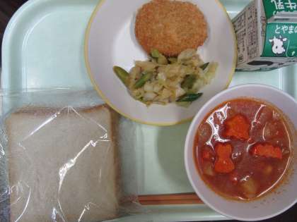 今日の給食です。ポークビーンズには、ニンジンを型抜きした「ねこ」「おばけ」「コウモリ」「帽子」が入っていました。入っていた人は、ラッキーですね。調理員さん、ありがとうございます。