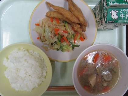 今日の給食は、牛乳、ご飯、ワカサギのフリッター、バンサンスー、サムゲタンスープです。