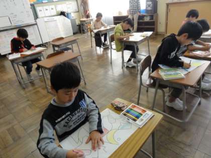 図画工作科の学習で、「どのような形が見えるかな」と図から見える形を子供たちは見付けました。いろいろな形を見付けた後、好きな色を各自が色鉛筆で塗りました。色を塗り終わった後は、パズルとして楽しむ予定です。