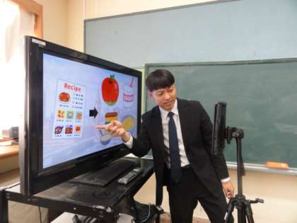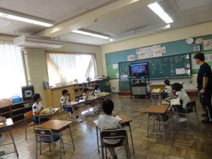 毎週の給食時間の、ALTの先生による英語のミニ番組を子供たちは楽しみにしています。今回は、デザートがテーマでした。クイズに答えながら楽しく英語を学んでいます。