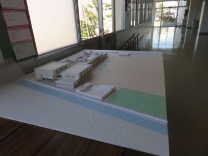 水橋学園の校舎の模型を、児童玄関前の廊下に展示しています。水橋地区の学校を巡回し、本校は11月29日まで展示される予定です。
