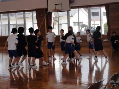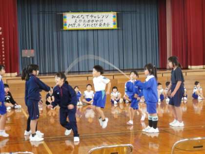 なわとび発表会の予行を行いました。全校縦割り班による8の字跳びでは、子供たちがこれまでの記録を超える回数を跳ぼうと、がんばっていました。