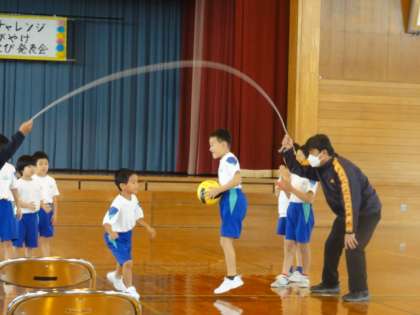 なわとび発表会の予行を行いました。1年・2年は、長縄に一緒に入ってボールの受け渡しをする技に挑戦しています。息の合ったペアの跳び方が、とてもよいです。