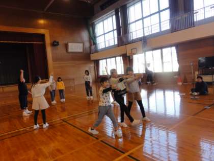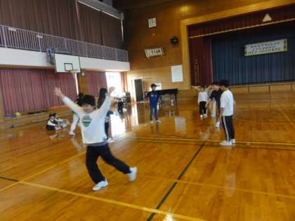 なわとび発表会の予行を終え、発表がもっとよくなるように練習をしています。縄を跳んだ後はポーズをして、自分のがんばりや表現を伝えています。
