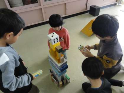 1年生は、算数科で箱の形の学習をしました。箱を高く積み上げながら、一つ一つの箱の形の特徴を捉えていました。