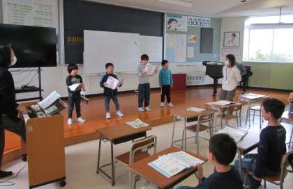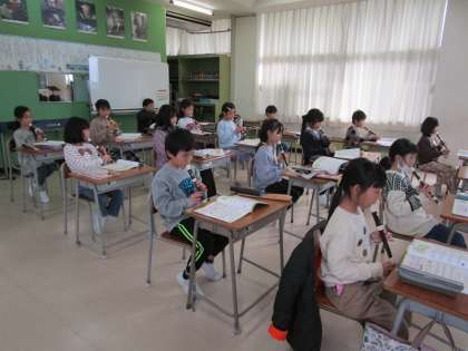 音楽の学習の様子です。1・2年生は、学年ごとに前に出て、口を大きく開けて歌っていました。3・4年生は、リコーダーできれいな音を響かせていました。