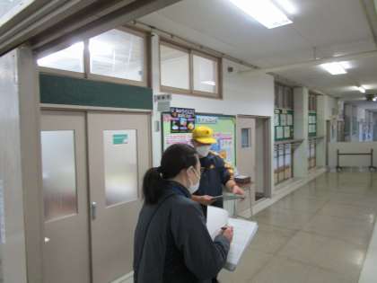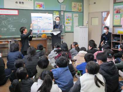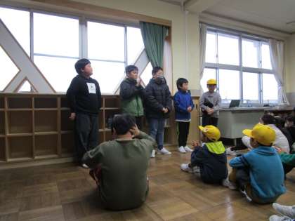 今日は、地震・津波の場合の訓練です。津波注意報の発令で全員2階に避難しました。振り返りでは、自分の言葉で考えながら話す姿が見られました。なお、雨天のため、屋上への避難や保育所や地域の方との合同避難訓練は、中止としました。