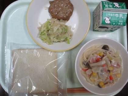 今日の給食です。温めた食パンは、柔らかくおいしかったです。調理員さん、ありがとうございます。
