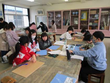 3・4・5年生は、図画工作科の学習で、版画に取り組んでいます。3・4年生は、できあがった子供たちから刷る予定です。5年生は、けがをしないように気を付けて彫刻刀で彫っていました。