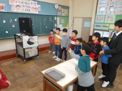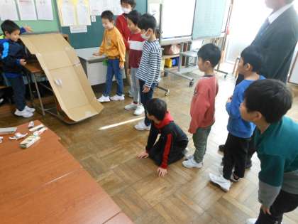これまで学級活動でお楽しみ会の準備を係で進めてきました。折り紙で作った飾りを黒板にみんなで飾ったり、そりすべりのジャンプを楽しんだり、紙飛行機を飛ばしてトンネルをくぐらせたりと、ゲームをみんなで楽しみました。