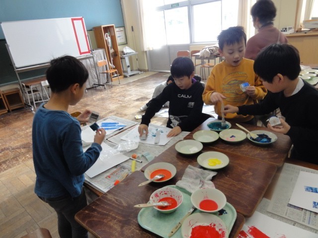1・2年生は、図画工作科で版画の製作に取り組んでいます。様々な材料に絵の具で色を付けた後、画用紙に押して、形を写します。子供たちは、形や色を楽しんで取り組んでいました。