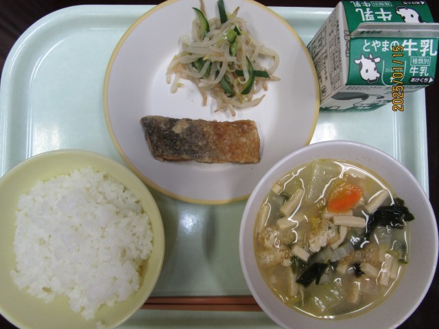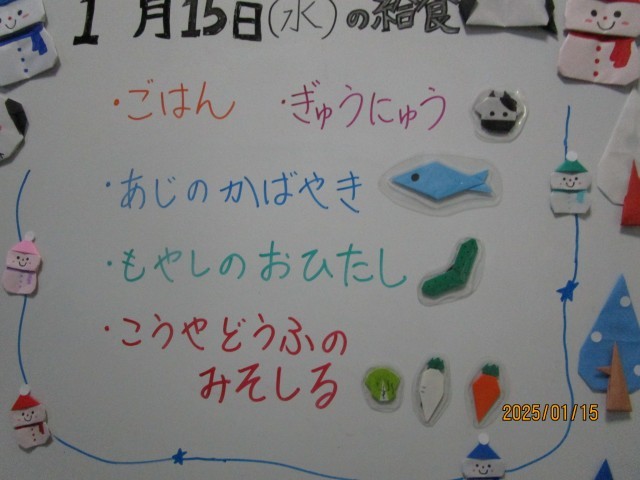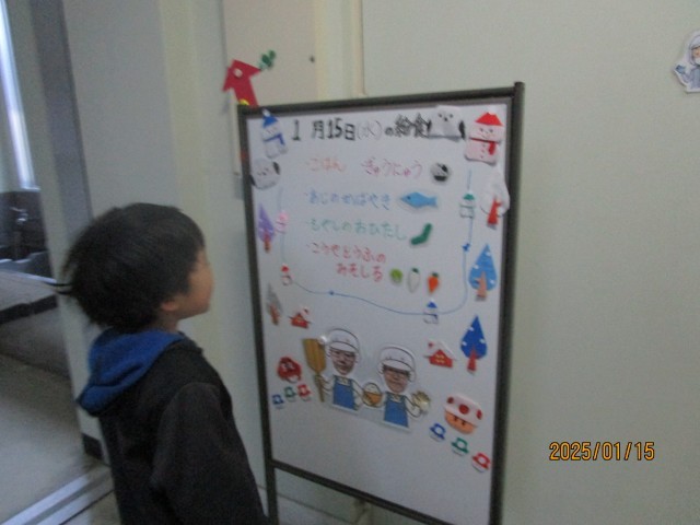 今日の給食です。立ち止まって献立を読み上げています。今日の給食も楽しみですね。
