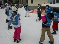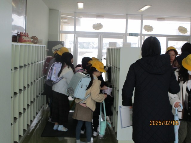 今日は、5限までの授業とし、14時30分、集団下校をしました。玄関前で、雪道の歩行について安全指導を行い、下校しました。