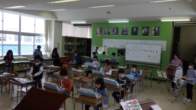 音楽科の学習では、「茶色の小びん」の合奏をしています。いろいろな楽器の音を合わせて、楽しんで演奏しています。