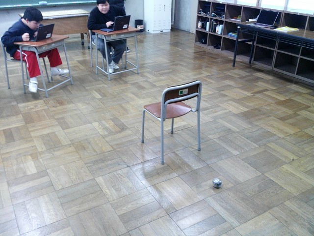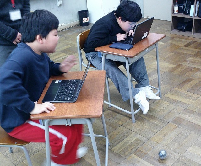 ICT支援員さんに教わりながら、プログラミングの授業を行いました。前に進ませたり、後ろに下がったりする動きだけでなく、左右に曲げたり、円を描くように曲げたりと試行錯誤しながら、ロボットを動かしていました。