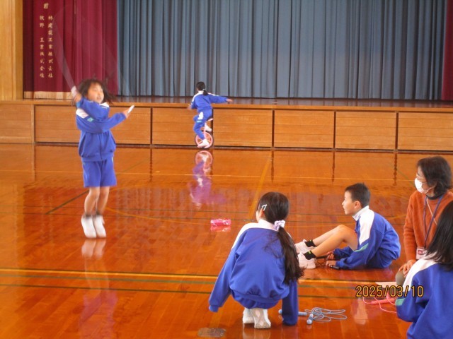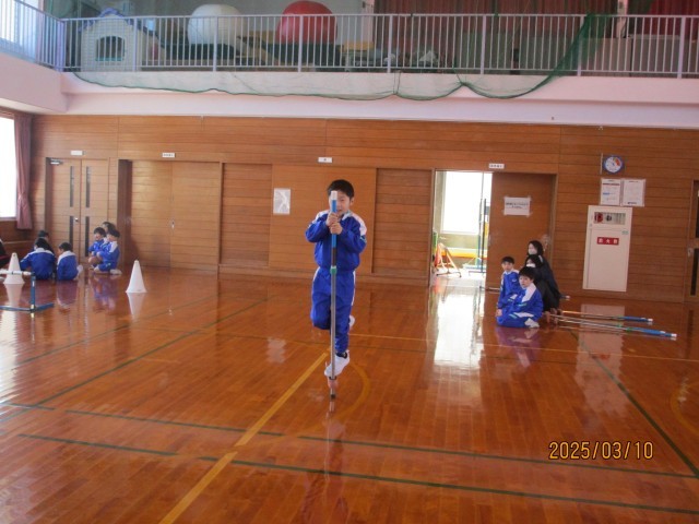 今日は、3学期に練習してきた種目のグループ発表を行いました。練習の積み重ねで、どの子も随分上手になりました。