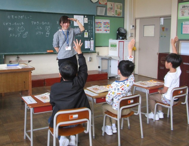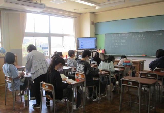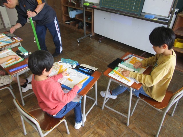 どの学年も算数の学習中です。6年生は、静かに集中して線対称な図形を描いています。1年生、2年生は、算数ブロックを使って考えています。