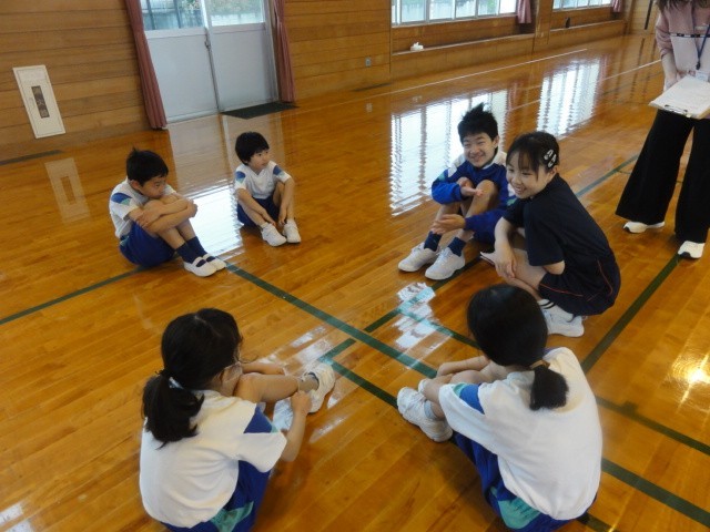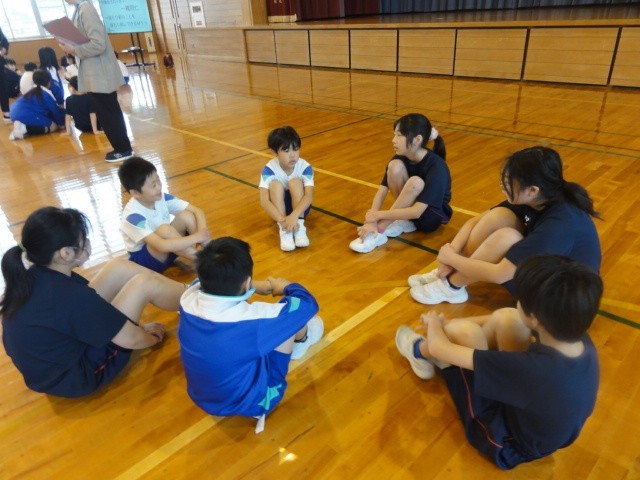 児童会発足式の後、今年度の新しい縦割り班で集まり、自己紹介等の活動をしました。グループで自己紹介をしたり、しりとりをしたりして、楽しく活動し、子供たちに笑顔があふれていました。