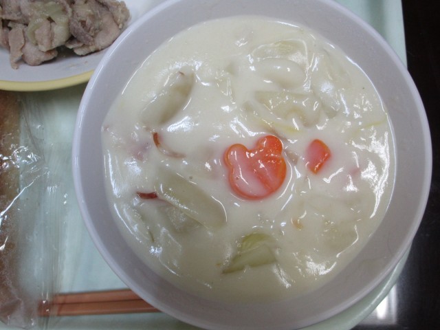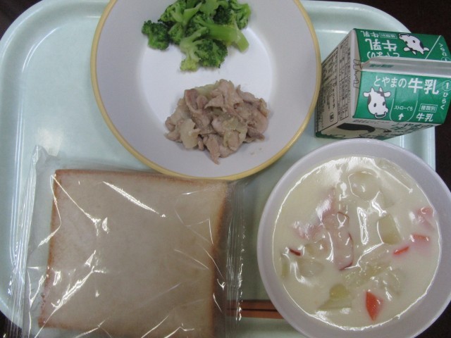 今日の給食です。食パンは、調理員さんがあたためてくださいました。温かく柔らかいです。