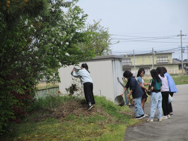 6年生の子供たちが進んで花壇の草むしりをしています。おかげできれいになりました。ありがとう。