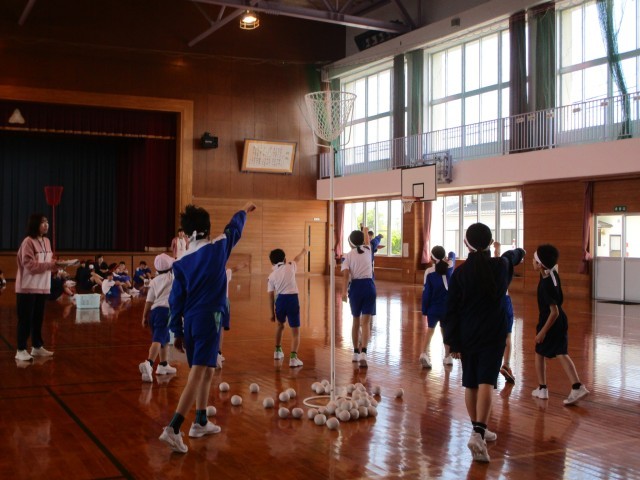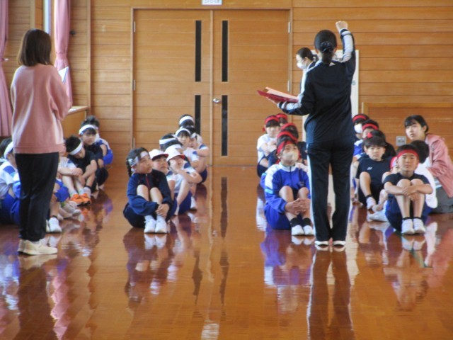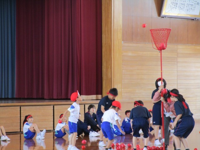 いきいきタイムに、玉入れの練習をしました。玉入れのやり方について、説明をしっかりと聞いています。1回だけの練習でしたが、上手に動くことができました。