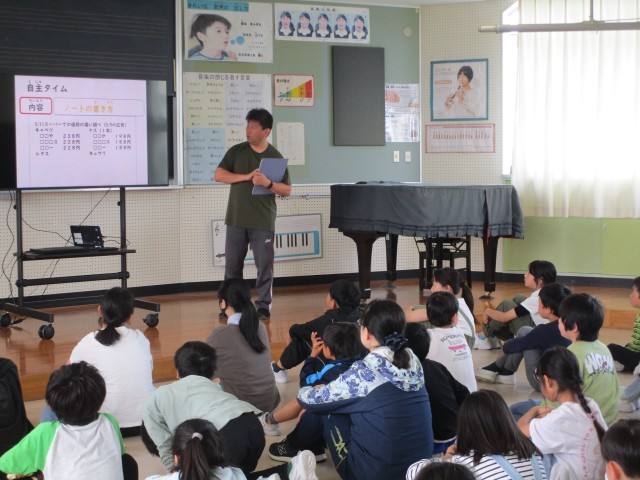 月曜日、水曜日の昼休みの後は、自主タイムです。今日は、自主タイムの取り組み方や内容、チャレンジ学習ノートの使い方について、話を聞きました。うなずきながら聞く子供たちや、調べたい課題が見つかった子供たちもいました。
