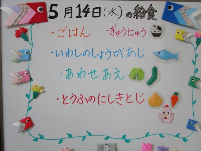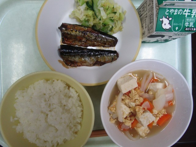 今日の給食です。イワシは、小さい方が1~2年生用、大きい方が3~6年生用です。