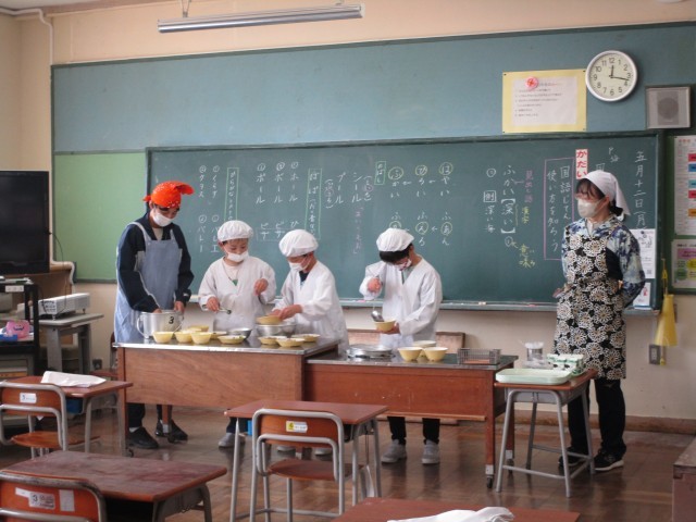 3年生は、給食の準備中です。上手に食器におかずをよそっています。