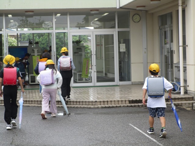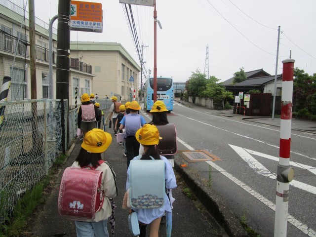 登校の様子です。安全帽子をかぶり、並んで歩いてきています。