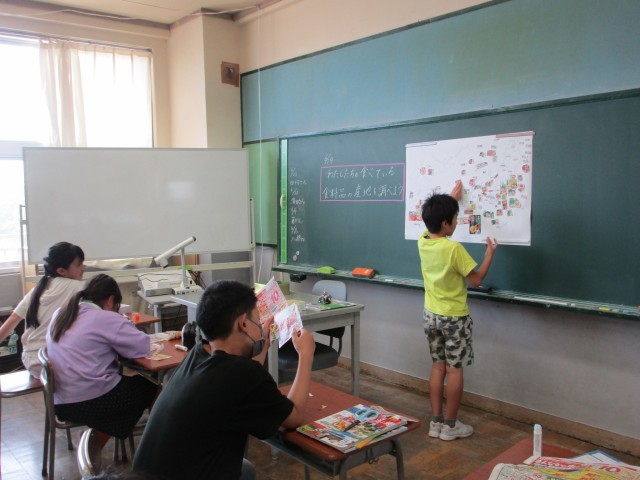 5年生は、社会科の学習で、食品の産地をスーパーの広告から見付け、日本地図に貼りながら、どの県が多いか話し合っています。