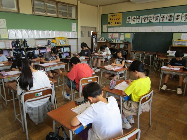 今週の啓明タイムは、教育相談です。個別に学級担任と話します。4年生の教室では、その間、集中して算数ドリルに取り組んでいました。