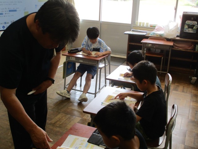 1・2年生の教室では、2年生は、算数科で長さの学習をしています。1年生は、ICT支援員の先生とクロームブックを使って学習しています。