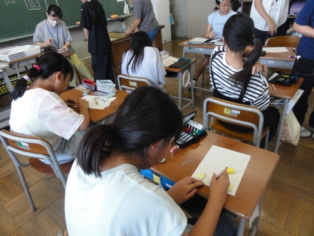 クラブ活動では、いろいろな活動やスポーツをしています。スポーツクラブは、今回ビーチボールをし、思い切り体を動かしていました。カルチャークラブでは、版に自分の名前を彫り、手作りのはんこを作成していました。