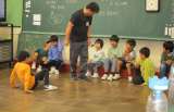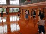 体育館では、1年生から5年生の子供たちが、一緒にドッジボールをしています。